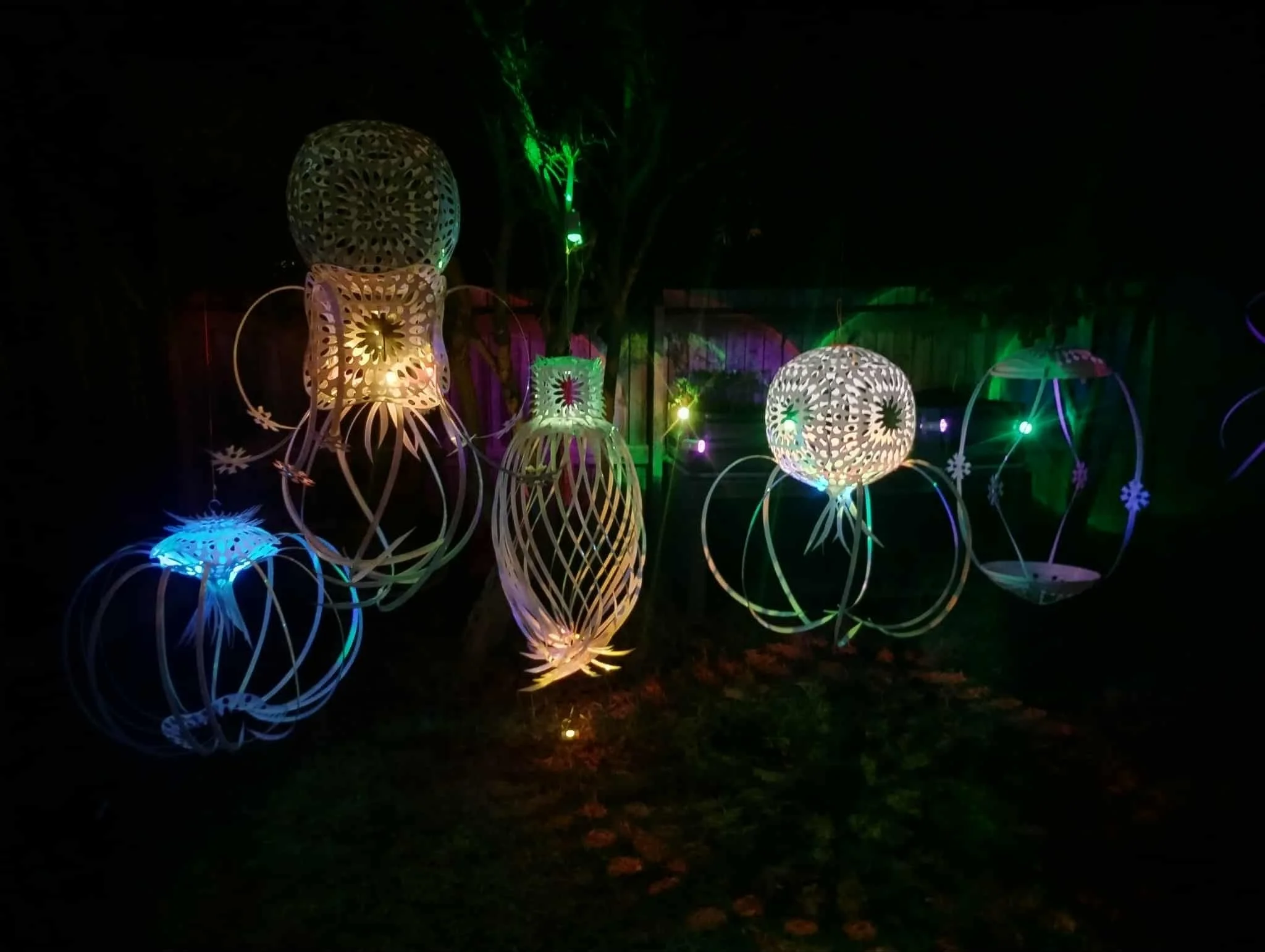An extraordinary exhibition of visual art by Canberra artist flutterbry (Bryan Fitzpatrick). Featuring over 100 sculptures made entirely from discarded plastic laundry hamper lids and cable ties, this collection transforms everyday waste into a vibrant world of creatures, flowers, and geometric forms.
